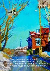 Бегут ручьи по улице моей, И птички очень радостно летают - Вот, наконец-то, к нам пришел апрель… И корки льда на лужах быстро тают. Припев: Весна на улице! Сугроб сутулится И очень сильно солнышко печёт. Весна на улице! И не осудится - Тот, кто эту песенку поёт =)