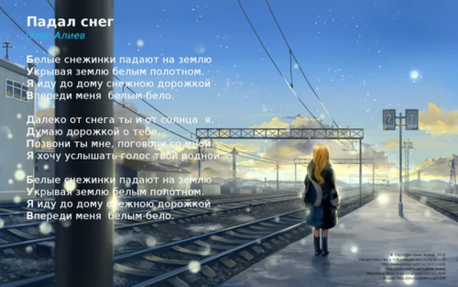 Падал снег Белые снежинки падают на землю Укрывая землю белым полотном. Я иду до дому снежною дорожкой Впереди очей моих белым-бело. Далеко от снега ты и от солнца я. Иду думаю дорожкой о тебе, Позвони ты мне и поговори со мной Я хочу услышать голос твой родной. Белые снежинки падают на землю Укрывая землю белым полотном. Я иду до дому снежною дорожкой Впереди очей моих белым-бело. © Copyright: Олег Алиев, 2014 Свидетельство о публикации №214102400815 https://www.youtube.com/watch?v=Y3AcQryxWgk