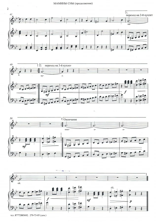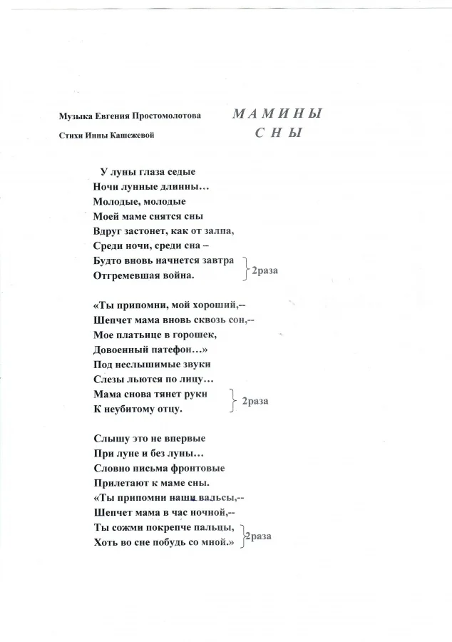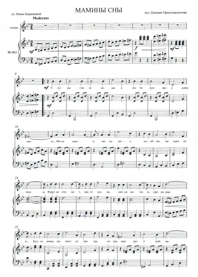 Песня Евгения Простомолотова на стихи Инны Кашежевой "МАМИНЫ СНЫ". Фортепианный клавир и лит. текст.