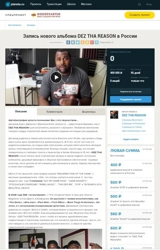 На сайте Planeta.ru вы сможете ознакомиться с темой данного проекта, прочесть биографию артиста, посмотреть видео обращение Десмонда к поклонникам в России, послушать его песни , посмотреть подробный план использования вырученных денег, оставить комментарии и личные сообщения ведущему проекта, и конечно поучаствовать в акциях.