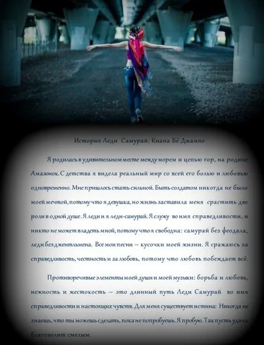 Я родилась в удивительном месте между морем и цепью гор, на родине Амазонок. С детства я видела реальный мир со всей его болью и любовью одновременно. Мне пришлось стать сильной. Быть солдатом никогда не было моей мечтой, потому что я девушка, но жизнь заставила меня срастить две роли в одной душе. Я леди и я леди-самурай. Я служу во имя справедливости, и никто не может владеть мной, потому что я свободна: самурай без феодала, леди без джентльмена. Все мои песни – кусочки моей жизни. Я сражаюсь за справедливость, честность и за любовь, потому что любовь побеждает всё.