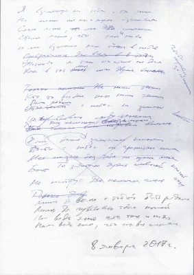 Сейчас со здоровьем стало лучше. 8 января решил себя испытать – взял в руки перо и за 30 минут написал новое стихотворение "Взгляд", черновик которого выставляю на ваше обозрение. Отчищенный текст на днях появится на моей поэтической полке. Будет возможность сравнить набросок и результат.
