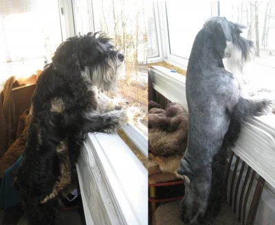 На фото Джонни в возрасте 3-х лет до и после тримминга. Трудно поверить, но это одна и та же собака с разницей в пару дней.
