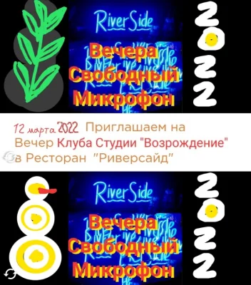 Приглашаем по субботам на Вечера - Концерты Клуба Студии "Возрождение" в Ресторан Риверсайд (Riverside), с 16 ч. до 21 ч, бардовский час до 22 ч, весь вечер до 23 ч. поем танцуем, приглашаем всех желающих - входной билет 500 руб (напитки и кушанья приносим с собой) плюс есть возможность заказа меню. Адрес - м.1905 года, ул. Мантулинская, д. 10. В программе вечеров - выступления артистов в формате - Свободный микрофон Клуба Студии "Возрождение", и других артистов, ансамблей инструменталистов, бардов, чтецов, танцоров и всех желающих выступить, танцевальный марафон, видео-фото съемка. Помощь вокалистам в подготовке концертных номеров, авторских песен, вокальные репетиции и работа по постановке голоса начинающим артистам - вокалистам (Ведет - Игорь Заиконников), В вечерах также принимают участие артисты с сольными программами - отделениями. Организуем выступление Групп - Ансамблей со своими объемами концертных работ, номеров, песен и программ, с репетициями и настройкой муз оборудования, чек-саундом перед видеосъемкой. Клуб "Возрождение" участвует в концертных программах и Свободных микрофонах на других площадках, будем рекомендовать - записывать наших артистов на московские мероприятия. Создается база концертных номеров исполнителей с возможностью дальнейшего продвижения артиста. Рекомендуем артистам Студии звукозаписи для записи песен (демо, концертные и студийные - по оптимальным ценам). Возможна по договоренности - Видео съемка мероприятий и создание концертных видео-клипов с монтажом. И др. вартанты творческого сотрудничества.