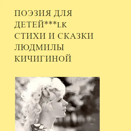 - 1. Людмила Кичигина-Шаинский фест 2025 Людмила Кичигина ТЕКСТЫ _ПЕРВЫЙ СБОРНИК - ПЕСНИ ДЕТЯМ _Людмила Кичигина-Шаинский фест 2025 http://stihi.ru/2025/01/18/7232 - основная.! http://stihi.ru/2025/01/14/6927 -первая публикация!сбой системы!Нет! ВНИМАНИЕ -ТАЛАНТЛИВЫМ МУЗЫКАНТАМ .. ___________________________________ СОЗДАТЕЛЯМ ДЕТСКИХ ПЕСЕН МУЗЫКАНТАМ И ВОКАЛИСТАМ - ТЕКСТЫ БУДУТ ОТДАНЫ БЕСПЛАТНО!!! (*ПРИ УСЛОВИИ УКАЗАНИЯ СОАВТОРСТВА)! ПРЕДЛОЖЕНИЯ В КОНТАКТЕ https://vk.com/id136446341 Людмила Кичигина LYUDMILA KICHIGINA _ POETRY AND SONGS http://stihi.ru/avtor/kiciginyiv ОМСК. ПЕРВЫЙ СБОРНИК АВТОРСКОЙ ПОЭЗИИ _ПЕСНИ ДЕТЯМ ! ____________________________________________________