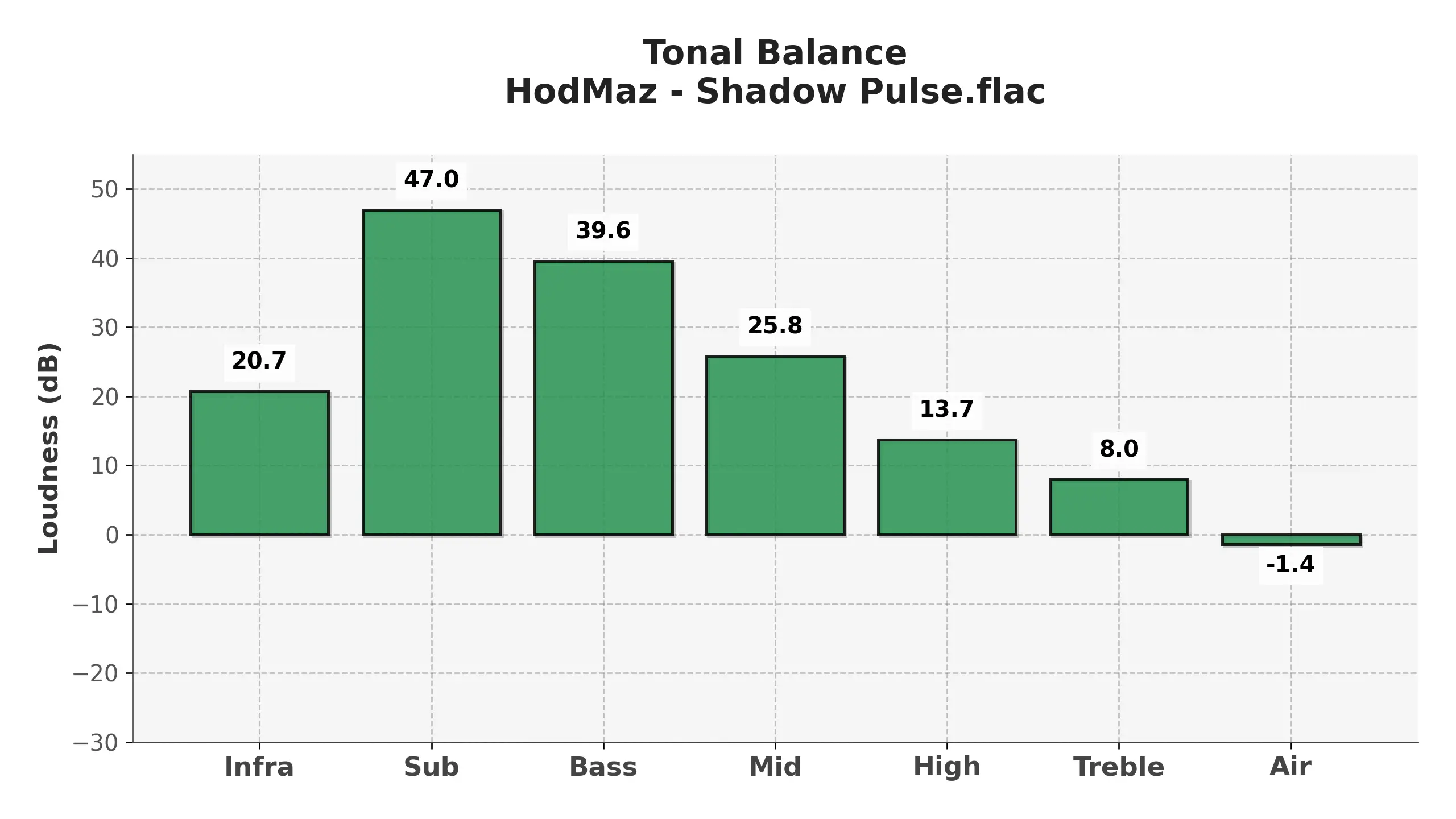 Для подтверждения теоретических выводов был проведён авторский эксперимент: создан музыкальный трек с частотным балансом, максимально соответствующим приведённым выше значениям. В результате получен звуковой материал, который демонстрирует, каким образом соблюдение оптимального тонального баланса отражается на восприятии музыки. Этот трек может служить практическим примером корректного распределения частот и использоваться как эталон для анализа (см. прикреплённое к этой записи изображение).