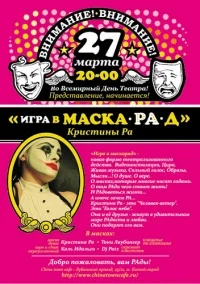 Долгожданный Первый Сольный Концерт-Представление Кристины Ра!!! "Игра в МАСКА-РАД" - должен состояться 27 марта, в 20.00 по адресу - Лубянский проезд, 25\12 КЛУБ "CHINA-TOWN-CAFE" - добро пожаловать! Будет несколько приятных неожиданностей, по мимо музыки: актерские выходки - видеоинсталяции одной одаренной девушки, проживающей в Берлине, и занимающейся прекрасным и любимым делом - фотоработы, не маленького размера, для РАдости глаз)) и пр. и пр. и пр. Приобрести билеты можно в клубе "ЧАЙНАТАУН КАФЕ" - подробности на сайте:www.chinatowncafe.ru Возможно заказать билеты: +7 926 533 6213 - Ирина +7 916 151 6453 - Милана