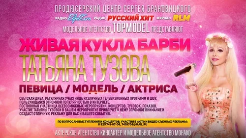 Российская певица, актриса, модель, известная под своим сценическим псевдонимом «Русская Барби». Родилась 8 декабря 1987 года в городе Москва. С 6 лет Татьяна училась в московской музыкальной школе по классу фортепиано и вокала. В школе Таня всегда выделялась своим ярким имиджем, экстравагантностью и любовью к розовому цвету.
