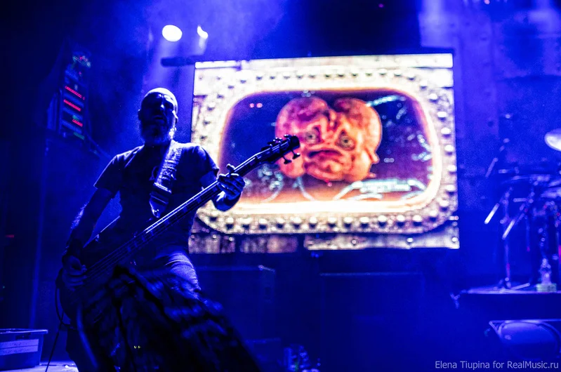 Дальше в перерыве уже скучать не пришлось, так как, видимо, в заботе о своих поклонниках хедлайнер запустил на двух небольших экранах, установленных на сцене, слайдшоу, состоящее из коллажей известных фотографий и картин. Фишка была в том, что в большинстве из них голова или лицо главного персонажа заменялись на не очень удачную фотографию самого DT. Некоторые были действительно очень смешные — настолько, что у некоторых финнов от смеха чуть пупы не развязались. Далее было небольшое мультяшное интро с тем самым огуречным существом в главной роли (Ziltoid), содержание которого лучше посмотреть самостоятельно, к тому же оно на английском языке. Кстати, его образ опять же немного напоминает самого DT. А после него первая же песня, сопровождением которой как раз и был графический эпос с уже той самой глазастой попой в главной роли.