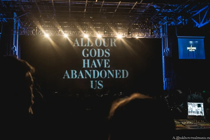 Разумеется, Stadium Live — слишком большая площадка для групп подобного толка, и даже в 9 вечера при желании можно было пройти в бок передних рядов, но когда чёрный полупрозрачный занавес с надписью «All Our Gods Have Abandoned Us» опустился, явив взору зрителей долгожданных виновников торжества, собравшиеся взорвались таким оглушительным криком, будто бы в зале был полный бескомпромиссный солдаут. Хотя до него, конечно же, было далеко. Зато на голове друг у друга никто не стоял.