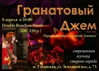 8 апреля в небольшом уютном клубе Double Bourbon Street на Таганке случится вечеринка, куда следует прийти за порцией тепла, хорошего пива и, самое главное - на стильный концерт. "Гранатовый Джем" экспрессивно исполнят современную музыку старого города (немного фанка в энергии рока, много солнца в голосе бас-гитаристки), "Джинсы" сыграют настоящий московский рок-н-ролл. Burbon - клуб, не обязывающий к какой-либо манере поведения. Если придете сюда в эту пятницу, 8 апреля, то сполна насладитесь свободой от суеты и насладитесь сполна звуками, эту свободу приносящими в небольшое и уютное помещение.