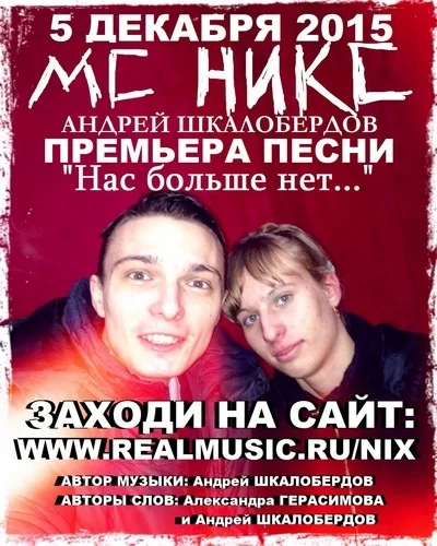 5 ДЕКАБРЯ 2015 ПРЕМЬЕРА НОВОЙ ПЕСНИ \"Нас больше нет...\"! АВТОР МУЗЫКИ: Андрей ШКАЛОБЕРДОВ... АВТОРЫ СЛОВ: Александра ГЕРАСИМОВА и Андрей ШКАЛОБЕРДОВ. Александра прислала мне свои стихи, а я записал песню)... Надеюсь, Вам понравится! СЛУШАЙТЕ! СКАЧИВАЙТЕ ПЕСНЮ! В Google введите МС НИКС! ОРГАНИЗАЦИЯ КОНЦЕРТА shkaloberdov@gmail.com МС НИКС (Андрей ШКАЛОБЕРДОВ)