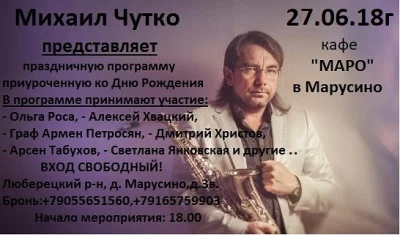 27 июня 2018 года состоится долгожданный концерт приуроченный ко Дню рождения Михаила Чутко. Вход свободный для всех желающих поздравить Михаила и послушать его творчество и творчество лиц заявленных в афише мероприятия! Начало мероприятия в 18.00. В программе принимают участие многие приглашенные гости-артисты. Конечно будет соло на саксофоне исполненное самим Михаилом, неожиданные дуэты и дегустация фирменного напитка от Михаила Чутко. В 23.00 будет подано маршрутное такси до станции метро "Выхино" Напомню адрес заведения: д.Марусино (Люберецкий район), д.3в.- Хинкальная-кафе "Маро" (находится при възде в д.Марусино прямо на Зенинском шоссе на 2м этаже ТЦ "Маруся", на 1 этаже только прод.магазин). Меню-вкусное, цены- ну, очень приятные. Как добраться: - От ст.метро "Котельники" - выход с 1 вагона из центра-и на лево выход№1,у ларьков маршрутка № 40 (до Марусино), и от жд.станции "Люберцы 1" (выход в сторону Октябрьского пр) - маршрутка №40 и 16.