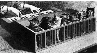 Одним из самых жестоких инструментов можно считать «кошачий клавесин», который изобрели в XVI веке. Необычная «игрушка» принадлежала королю Испании Филиппу II. «Кошачий клавесин» представлял собой длинный ящик, разделенный на семь или четырнадцать отсеков. В каждый отсек сажали заранее отобранных кошек, чьи хвосты жестко прикреплялись к клавишам. При каждом нажатии клавиши острая игла впивалась кошке в хвост, и животное издавало #звук. Отбор пушистых созданий проходил очень тщательно. Пойманным со всей округи котам специально обученный «настройщик» наступал на хвосты и слушал их истошное мяуканье, по высоте которого определял их по отсекам. Несчастные коты и #кошки, которые не прошли отбор обычно тут же сжигались, так как в то время эти животные считались посланниками сатаны и его помощниками.