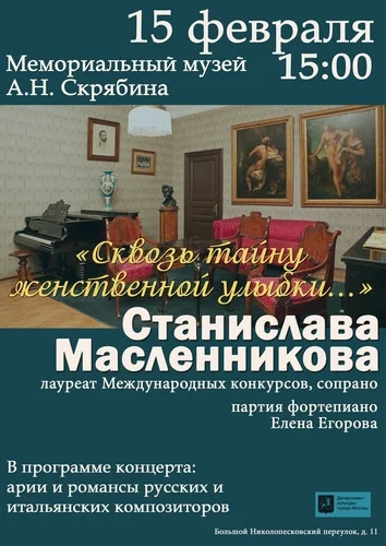 Победительница международных конкурсов Станислава Масленникова (сопрано) исполнит программу \"Сквозь тайну женственной улыбки\", включающую в себя романсы и арии русских и итальянских композиторов.